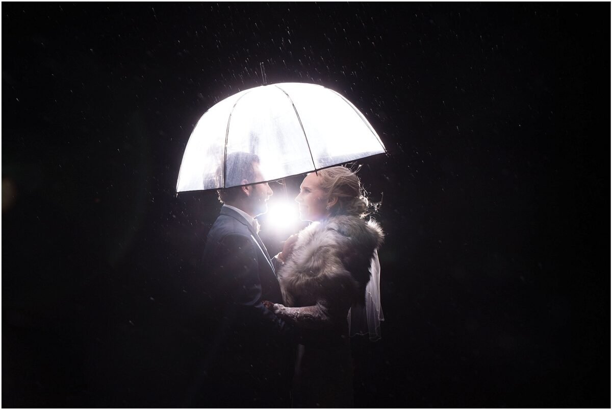 OK back on track (it is midnight as I’m typing this so I’m a wee bit tired!) I want to share with you the most magical moment of the day. Stewart, Emily and I were thrilled that it unfolded the way it did. If you follow me on Instagram or if you frequent this blog then you know how much I love creating photos for people at night. But there is a certain element of patience and skill that is needed to pull such photos off. Just before dinner I looked outside and I thought to myself that we just might be able to get that one magical Winter wedding photo. But it would take some walking through a messy parking lot to find the right place. I asked Emily and Stewart if they would be up for this after they were finished eating. They were! Stew and Emily followed me out to the furthest point of the parking lot where there were no cars or utility wires in the background. The wind was whipping around and was truly making it hard to see and concentrate. I got everything set up just started clicking in hopes for that magic photo. Then it started sleeting. All the while this beautiful couple was standing so still for me. But the sleet was exactly what we needed to give us that perfect photo. Sounds crazy I know, but it was just the moment we had waited for all day photographically speaking. And if you come into my studio you’ll see one of those photos in a 20×30 Acrylic already on my wall! It’s absolutely my favorite photo from their wedding! You’ll also see it below at the very end of this preview post.